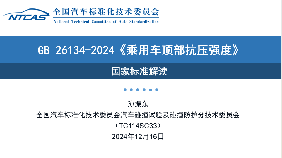 GB 26134—2024《乘用车顶部抗压强度》标准规定了乘用车顶部抗压强度试验的技术要求及试验方法。该标准的实施,有利于引领汽车行业稳步提升乘用车顶部抗压防护性能,提高乘用车翻滚防护性能安全水平,进一步降低道路交通事故人员伤亡,保障人民生命安全。本强制性标准是主管部门加强汽车产品管理、引导和规范行业发展的重要依据,也是指导企业产品规划和研发的重要技术文件。